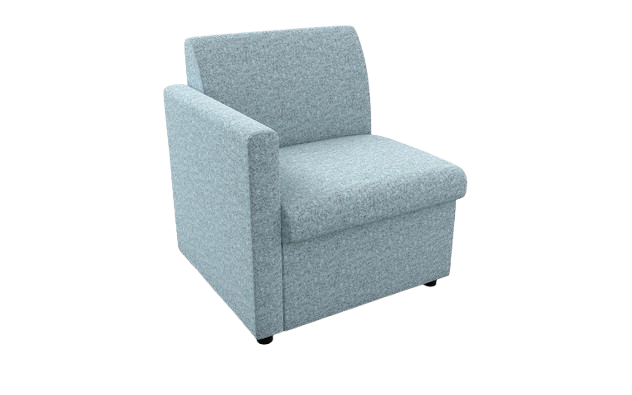 A conventional low-level modular seating system ideal for reception and breakout areas. Single seat with right armrest and  black nylon feet Arm position described from sitting position.